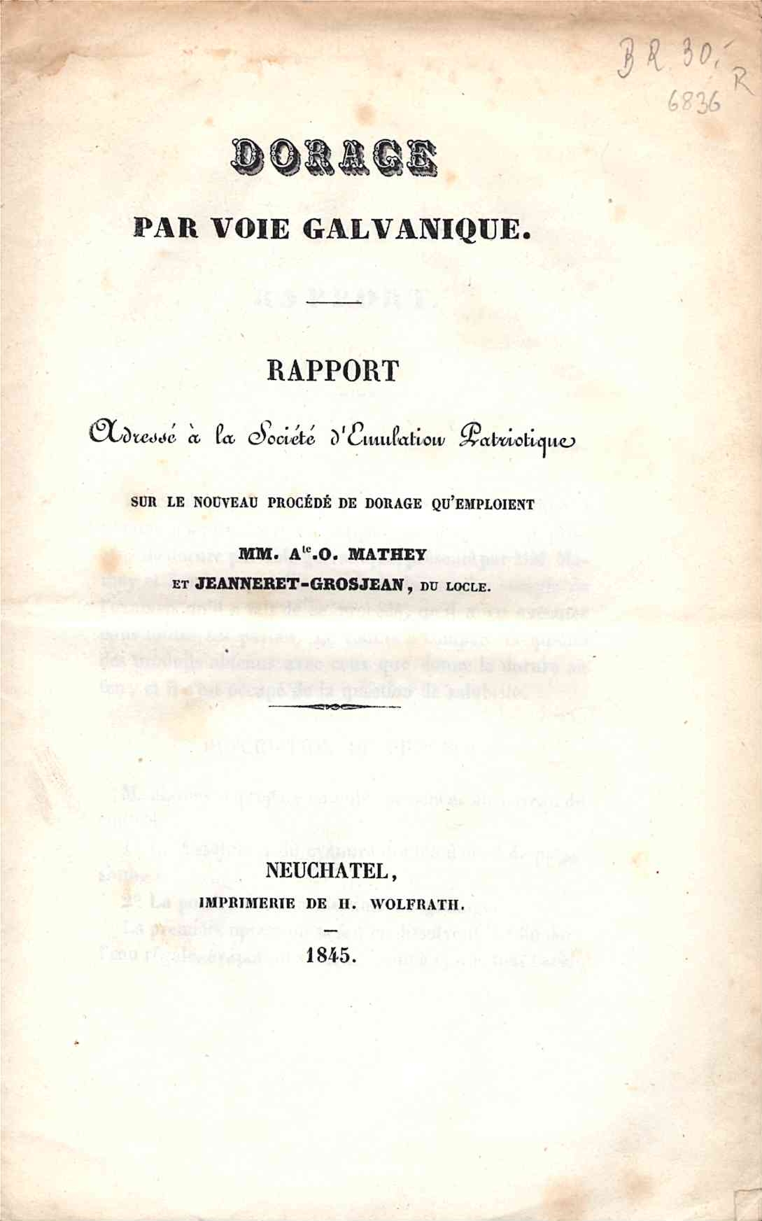 Rapport adressé à la Société d'Emulation patriotique sur le nouveau procédé de dorage qu'emploient MM. Mathey et Jeanneret-Grosjean, du Locle.